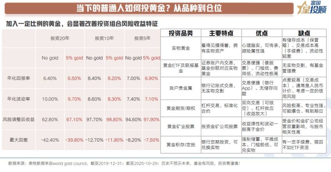 桥水基金创始人瑞·达利欧提到,所有人都应该先问自己一个最简单、最基本的问题:如果自己完全不知道黄金或其他市场未来会怎么走,自己的组合里应该配多少黄金?换句话说,对于普通人而言,应该从战略配置角度,而不是“押注涨跌”角度去考虑。实践证明在投资组合里,加入一定比例的黄金,会显著改善投资组合的风险收益特征。目前市场一个约定俗成的比例在5%-15%区间。