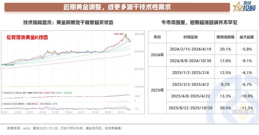 从技术指标来看,伦敦现货黄金自8月下旬3273美元/盎司,上涨至10月20日4381美元/盎司,其过程基本是一气呵成,中间未见明显的调整。这样快速上涨的节奏,使得黄金短期交易的拥挤度上升,短期价格均线偏离程度高,短期超买状态下存在技术性回调的需求。此外,从下图右侧表格可以看到,2024年以来黄金价格短期超涨回调并不罕见。