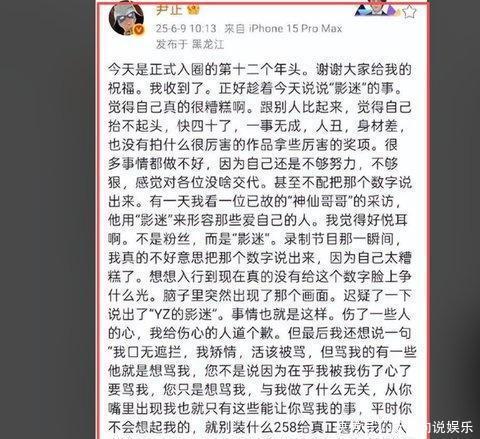 尹正说自己“一事无成”,这句话在事实层面不准确,在情绪层面却很真,既有对粉丝的愧疚,也有中年演员面对失衡名利时的挫败感,他觉得自己既没红到可以保护粉丝的地步,又没稳到可以抵挡争议,只能苦笑着把所有压力往自己身上兜,这种状态,既是他个人性格的体现,也折射出很多在中间地带挣扎艺人的共同处境。